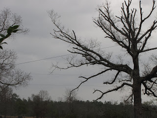 I slept in a bit today. It was hard not to since it was so overcast out; it made for a nice, dark bedroom. As I was drifting in and out of consciousness, I could hear heavy machinery working outside...seemed really close to our house. When I got out of bed and looked out the front window, I saw why it sounded so close! A whole crew of folks was working on cutting down a couple of dying oak trees that were a danger to power lines, passing traffic, etc., one of which was at the edge of our property.